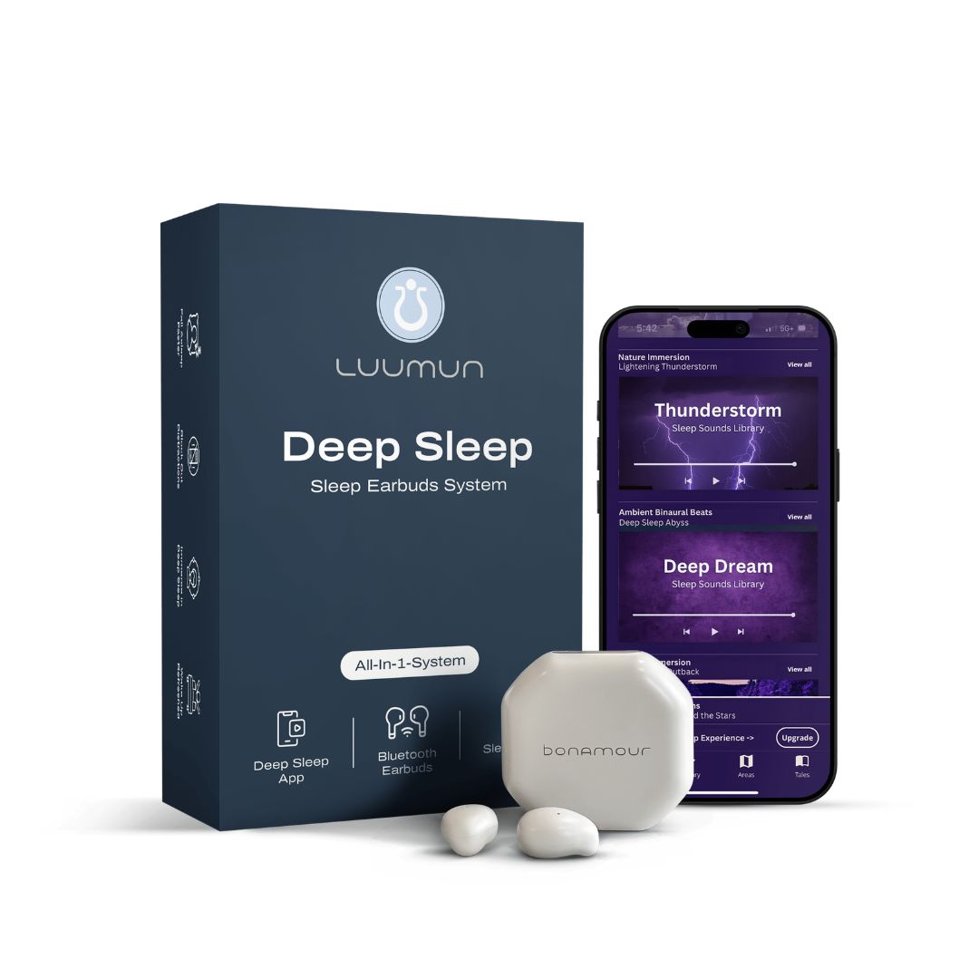 Luumun Sleep System pairs premium sleep earbuds with the Luumun Sleep App—featuring guided sleep sessions and a curated sleepscapes library. App access included. No subscription required.